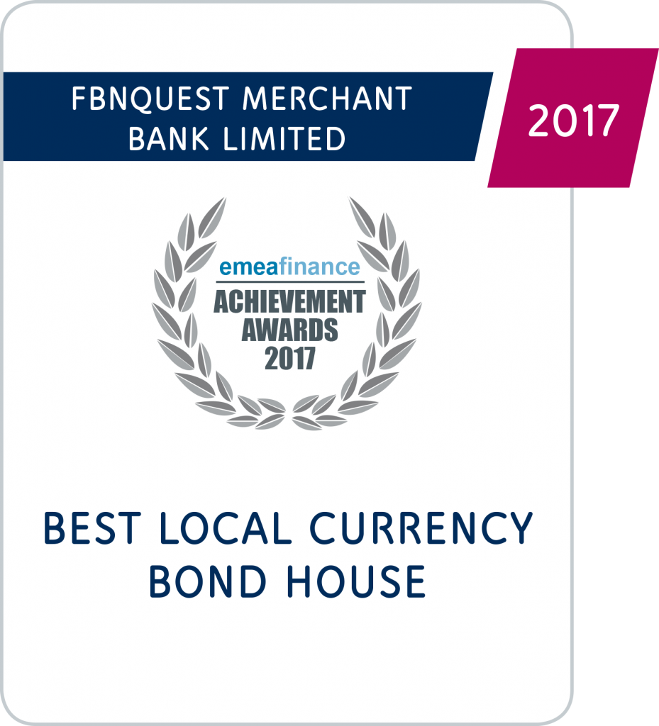 FBNQuest Merchant Bank won an award for ‘Best Local Currency Bond House’ by EMEA Finance. The award was given in recognition of FBNQuest Merchant Bank’s role in deals including the Mixta Real Estate PLC bond, Municipality Waste Management Contractors Limited Notes issuance, Dufil Prima Foods PLC bond issuance and Financial Adviser to the Federal Government of Nigeria’s debut sovereign Sukuk.