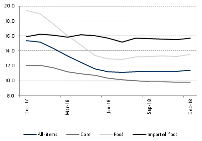 The latest report from the NBS has headline inflation y/y at 11.4% in December, a rise of 16bps on the previous month. Food price inflation rose by 26bps to 13.6% y/y while the core measure was unchanged at 9.8%. Our expectation, shared with the wires, was 11.8% y/y for the headline measure, based upon the view that insecurity in food growing areas would have a greater negative impact.