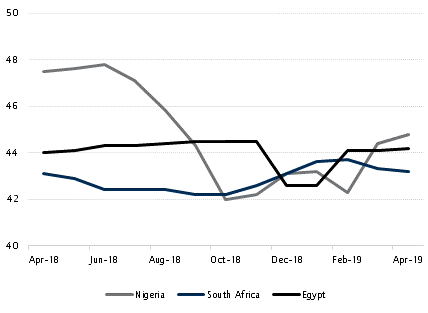 - While Nigeria has a sizeable buffer by any criteria, we should note the trend over the past decade and a half of a diminution in its current-account surplus to a modest level around 1% of GDP. This is caused by a combination of flat oil exports, and of rising import demand for demographic reasons. Egypt has a regular deficit on its current account, not being a sizeable oil exporter, but can take heart from a growing net surplus on services (US$7.3bn in H2 2018, compared with Nigeria’s rising deficit of US$15.4bn in the same period).